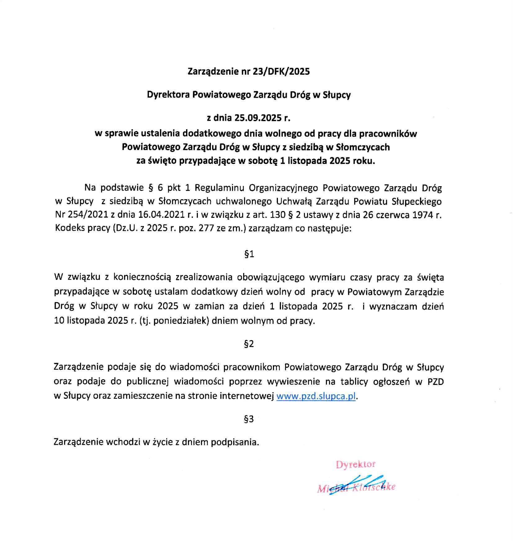 Zarządzenie nr 23/DFK/2025 w sprawie dodatkowego dnia wolnego za 1 listopada